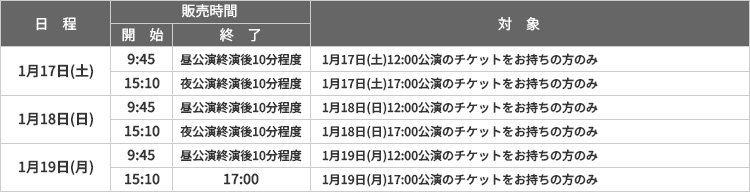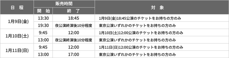 - 会場でのグッズ販売は本公演チケットをお持ちの方のみ、ご購入いただけます。お持ちのチケットによりご購入いただける日時が異なりますので、詳細は上部販売時間表をご確認の上、ご来場ください。